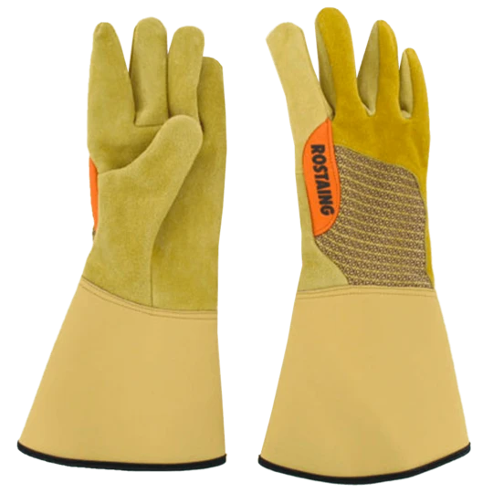 De mooiste rozenhandschoenen van topkwaliteit runderleer. Hiermee werk comfortabel en met een goede pasvorm. Het soepele leer blijft ademend waardoor je handen beschermt blijven zonder te gaan zweten. Wie wel eens in de rozen zit weet hoe pijnlijk doorns kunnen zijn. Speciaal daarvoor ontwikkelde handschoenen helpen je om het snoeiwerk aan rozen leuk werk te blijven vinden. De verlengde manchet geeft extra bescherming tegen doorns en planten die de huid kunnen irriteren.